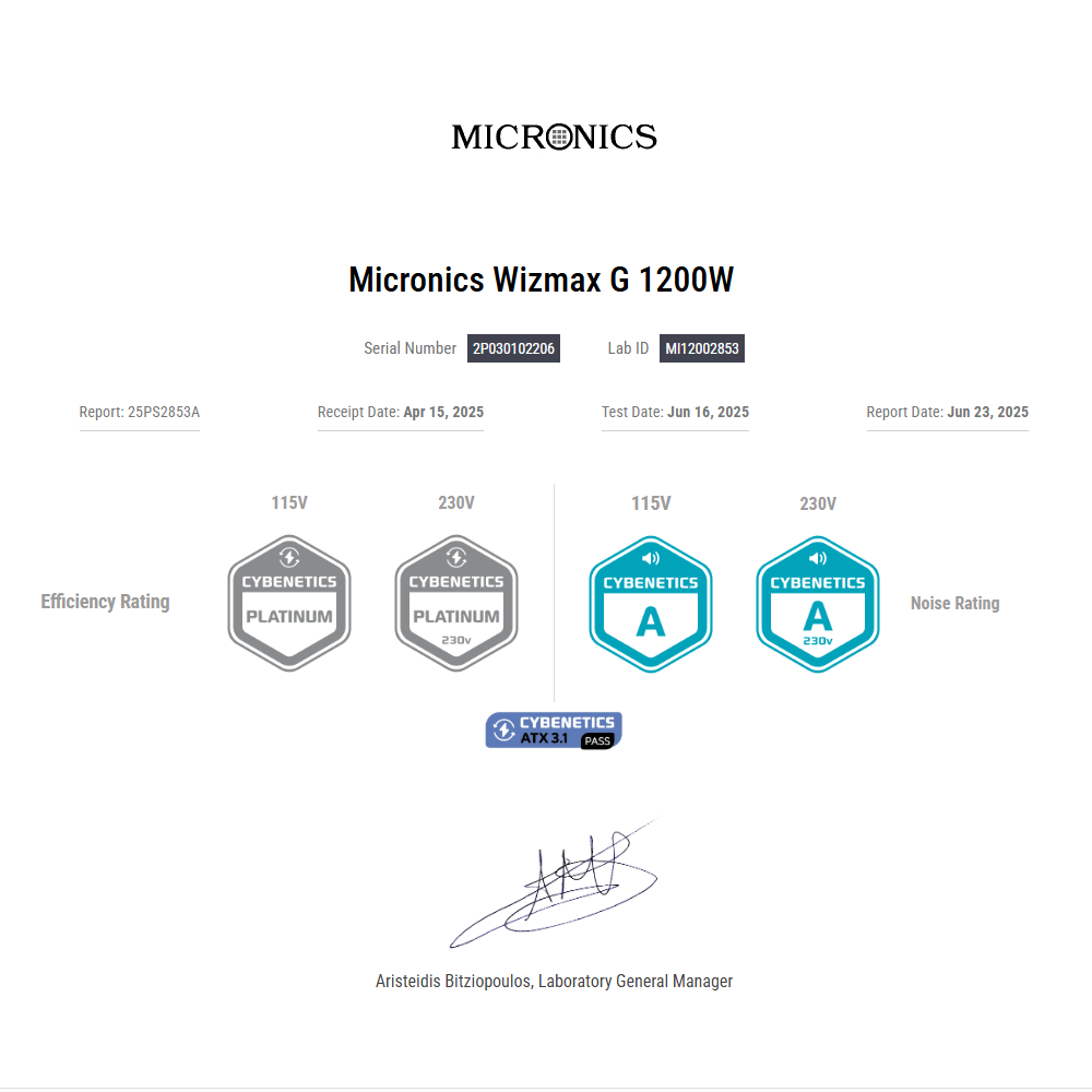 마이크로닉스 WIZMAX G 시리즈는 Cybenetics의 까다로운 테스트를 통과해, 전력 효율과 소음 부문에서 모두 공식 인증을 획득했다. ETA 및 LAMBDA 인증을 통해, WIZMAX G는 고출력 환경에서도 우수한 전력 효율성과 정숙한 작동 성능을 동시에 갖춘 프리미엄 PSU로 평가받는다.