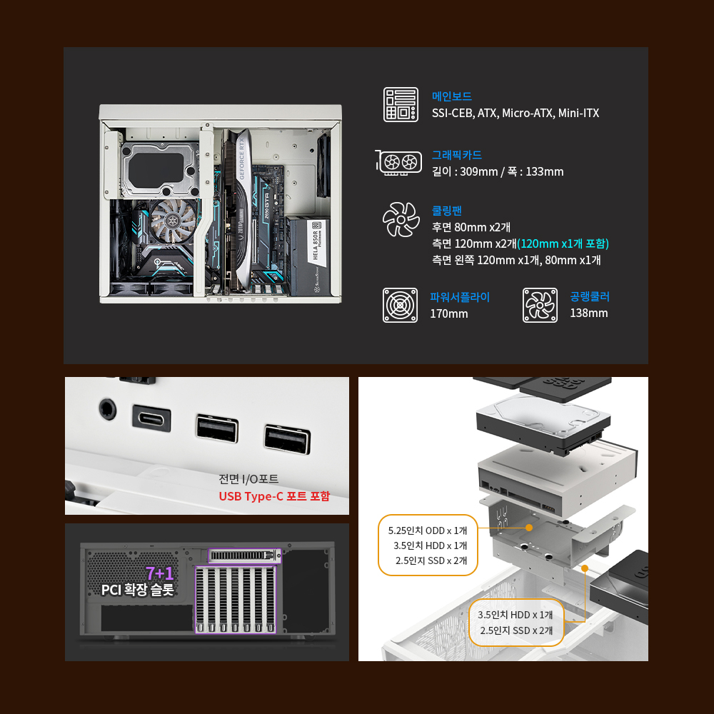 스토리지 확장성도 뛰어나다. 범용 드라이브 케이지를 통해 외부 5.25인치 1개(또는 3.5인치 1개, 2.5인치 2개 대체 가능), 내부 3.5인치 1개(또는 2.5인치 1개 호환), 독립 2.5인치 베이 1개를 지원해 다양한 저장장치 조합이 가능하다.