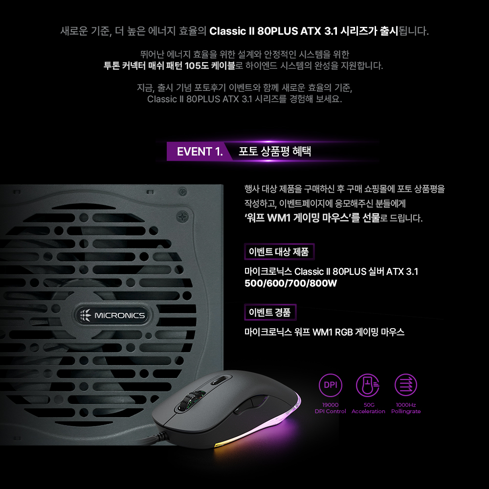 한편, 마이크로닉스는 2025년 9월 10일부터 10월 31일까지 클래식 II 풀체인지 실버 ATX 3.1 시리즈 출시 기념 행사를 진행한다. 행사 기간 동안 제품 포토 상품평을 작성하고 마이크로닉스 이벤트 페이지에 응모하면 워프 WM1 게이밍 마우스를 받을 수 있다. 또한, 참여자 중 추첨을 통해 스타벅스 e카드 교환권 1만 원권이 추가로 증정된다.