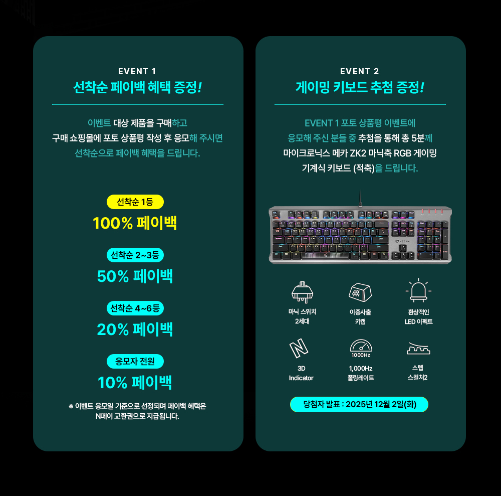 1등은 구매 금액 전액을 돌려받는 100% 페이백, 2~3등은 50%, 4~6등은 20%의 금액이 환급되며, 모든 응모자에게는 10% 페이백 혜택이 주어진다. 선정은 이벤트 응모일 기준으로 진행되며, 혜택은 N페이 교환권 형태로 지급된다.