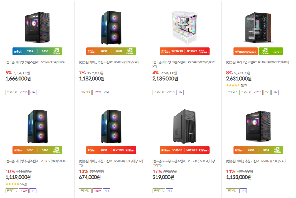 주요 구성은 인텔 코어 울트라5 225F + RTX 5070, AMD 라이젠5 7600 + RTX 5060, 라이젠7 7800X3D + 라데온 RX 9070 XT, 라이젠9 9800X3D + RTX 5070 Ti 등으로, 가성비의 균형을 고려한 세팅으로 구성됐다.
