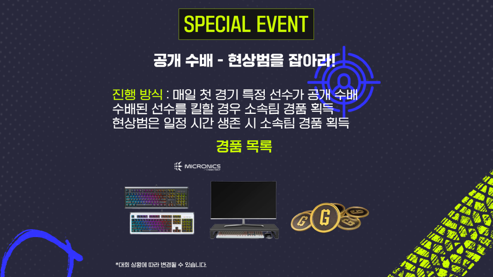 이번 결승전에서도 마이크로닉스가 준비한 특별 이벤트 ‘공개 수배전 – 현상범을 잡아라’가 함께 진행된다. 매 경기 첫 라운드마다 지정된 ‘현상범’을 제압한 팀에게는 마이크로닉스 게이밍 키보드, UV-M100 살균 모니터 받침대, G-COIN 등 다채로운 경품이 주어진다.