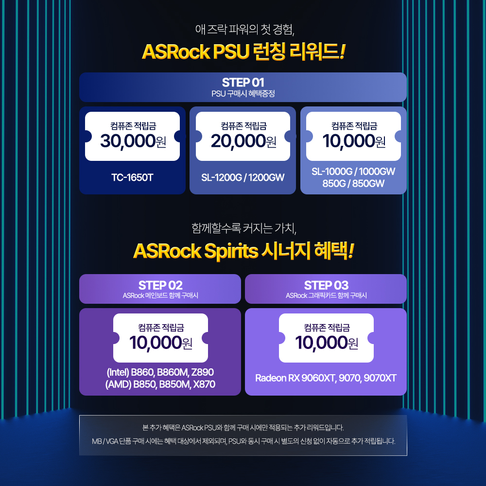 행사 기간 동안 ASRock 파워서플라이 구매 고객에게 최대 3만 원 상당의 컴퓨존 적립금을 제공한다. TAICHI TC-1650T 구매 시 3만 원, 스틸레전드 SL-1200G 및 SL-1200GW 구매 시 2만 원, SL-1000G·SL-1000GW·SL-850G·SL-850GW 구매 시 1만 원 적립 혜택이 제공된다.
